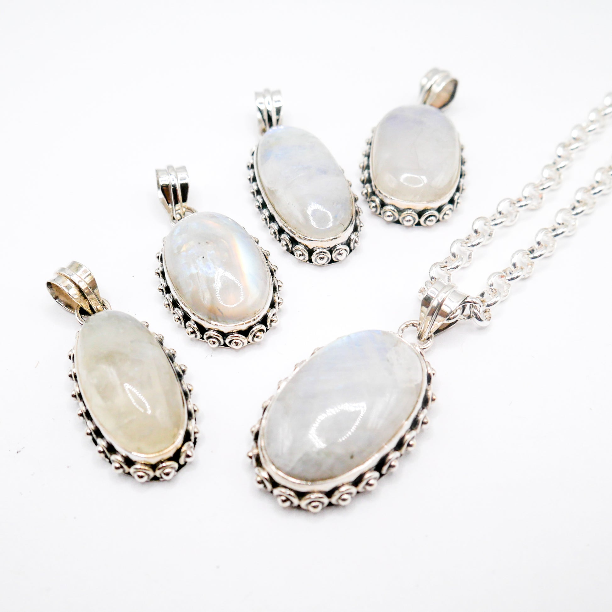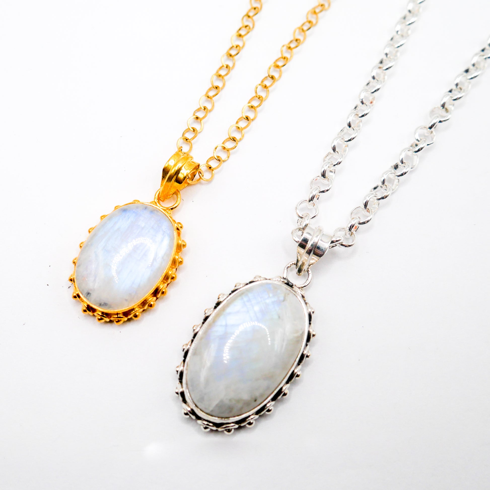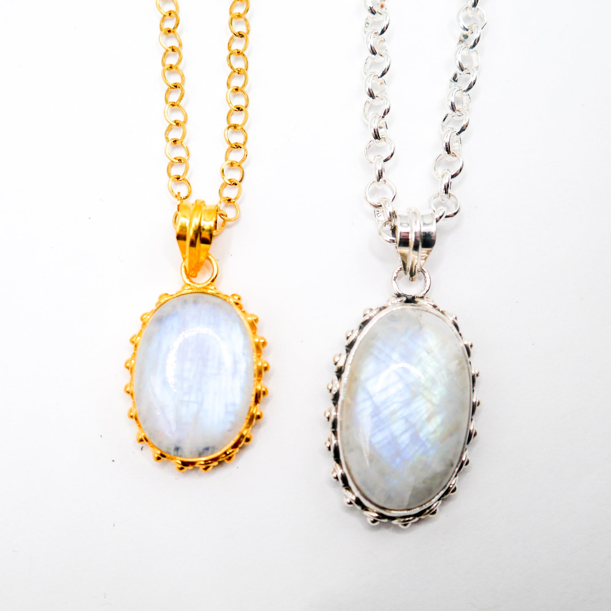 Our Moonstone Oval Necklace is crafted with genuine Sterling Silver and features a luminous moonstone set in a rounded oval pendant. The dotted detailing along the edges adds a playful yet refined touch, making this piece both fun and elegant. To complement the pendant, the necklace is paired with a delicate rolo circle chain.