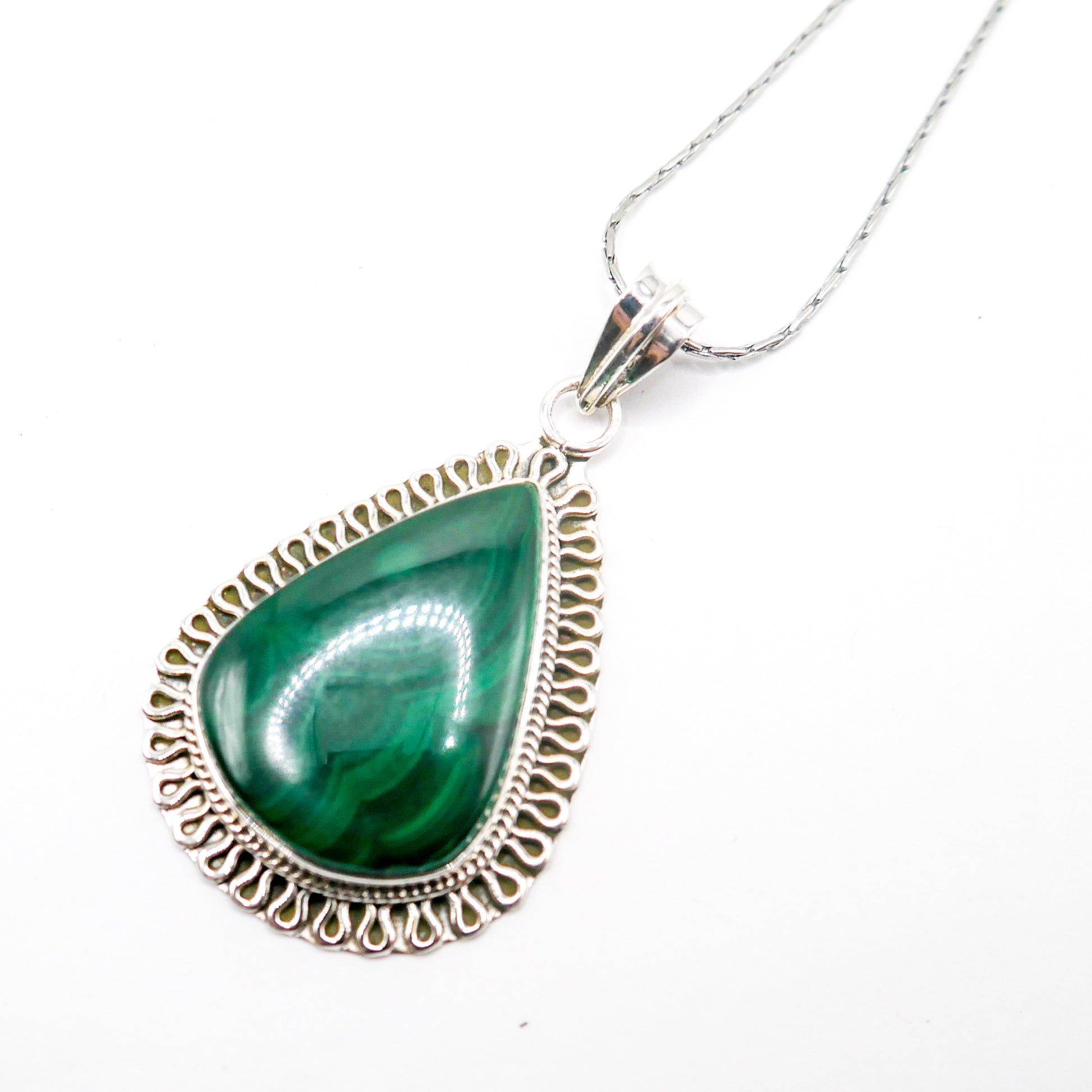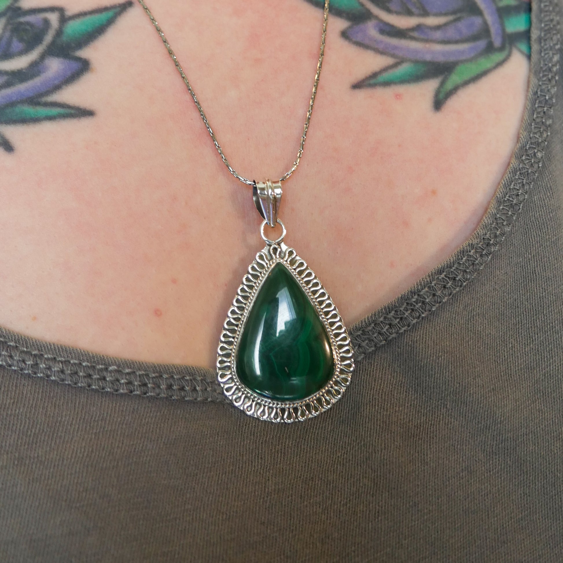 The Fortify Malachite Necklace is crafted from Sterling Silver and showcases a luminous Malachite teardrop pendant with embossed, flowing lines, creating a unique and organic design. Radiating delicate, feminine charm, this necklace is perfect for everyday wear or for layering effortlessly with other favorites in your collection.