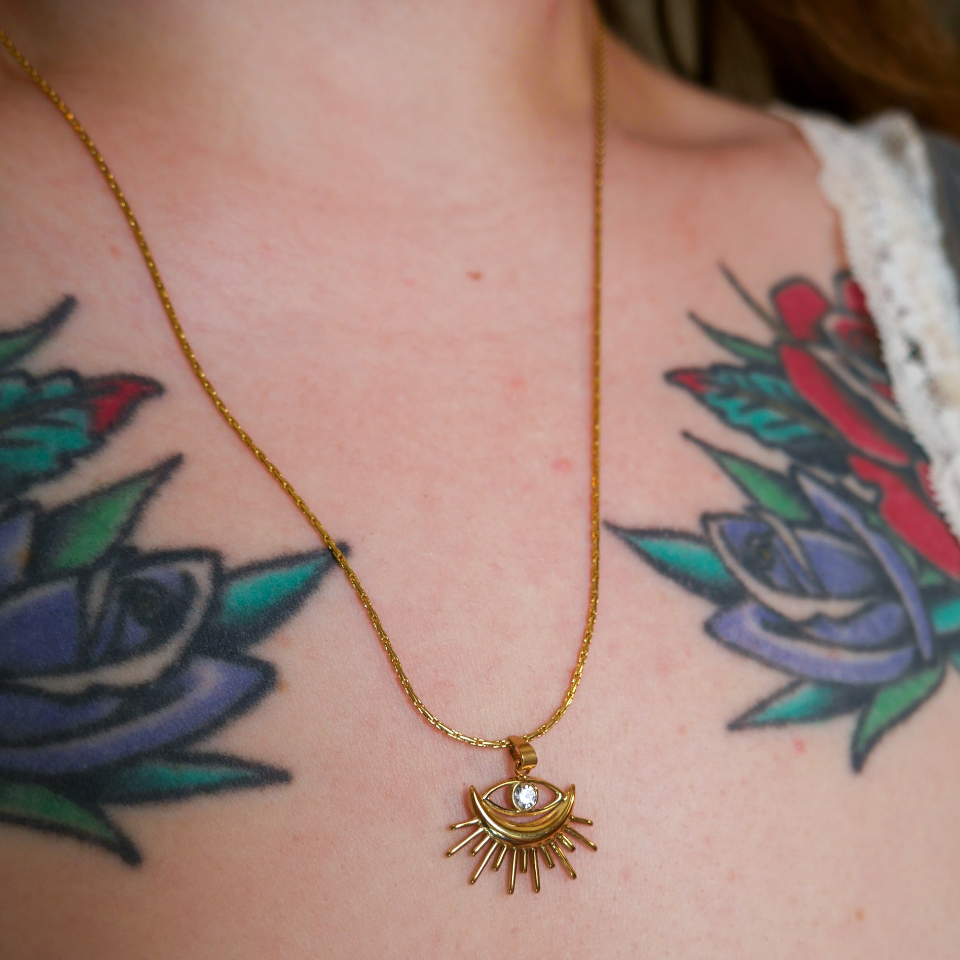 This stunning Evil Eye Necklace features a symbolic pendant paired with a 24-inch stainless steel chain. Its longer length makes it perfect for layering with other pieces in your collection, while its bold presence allows it to stand out beautifully as a solo statement piece.