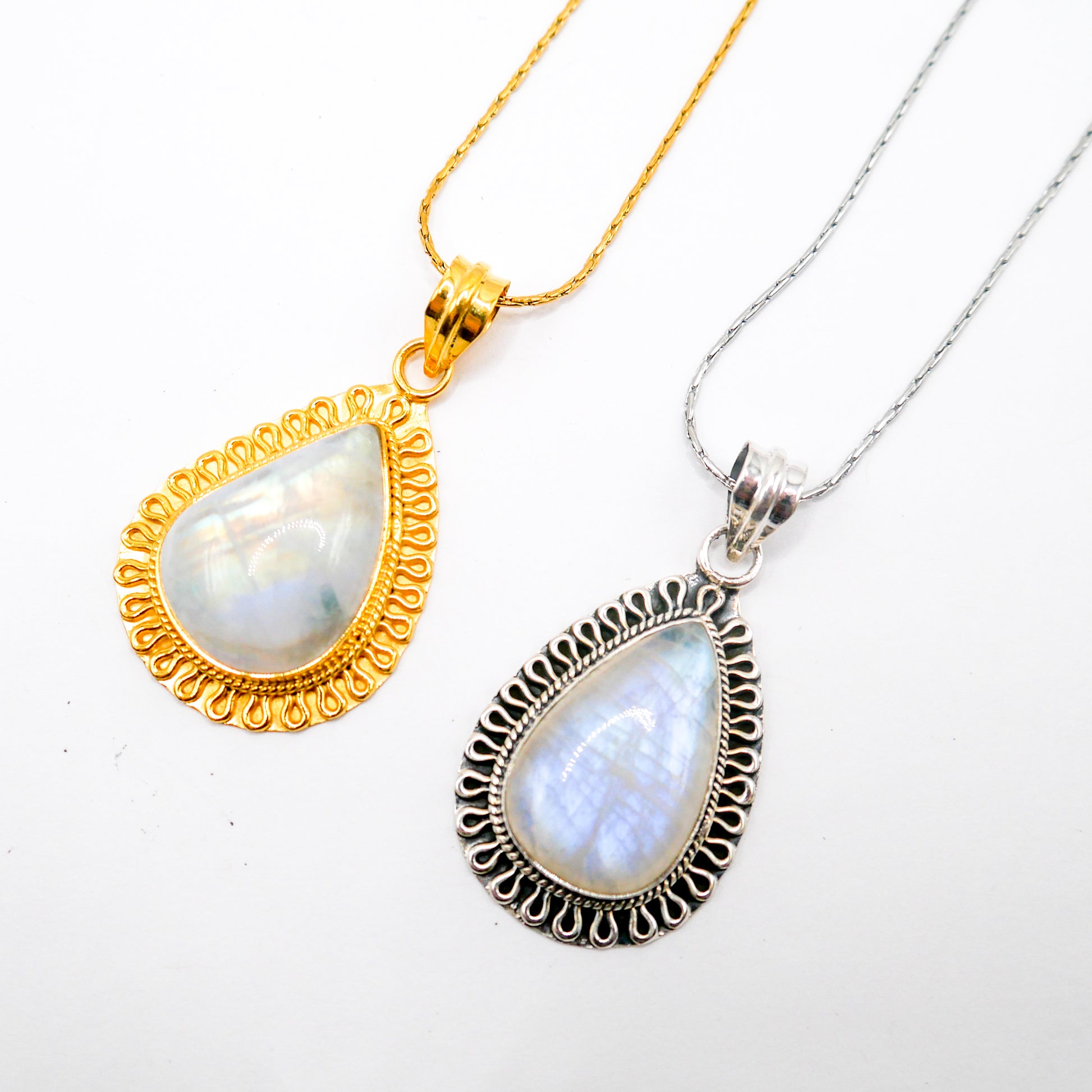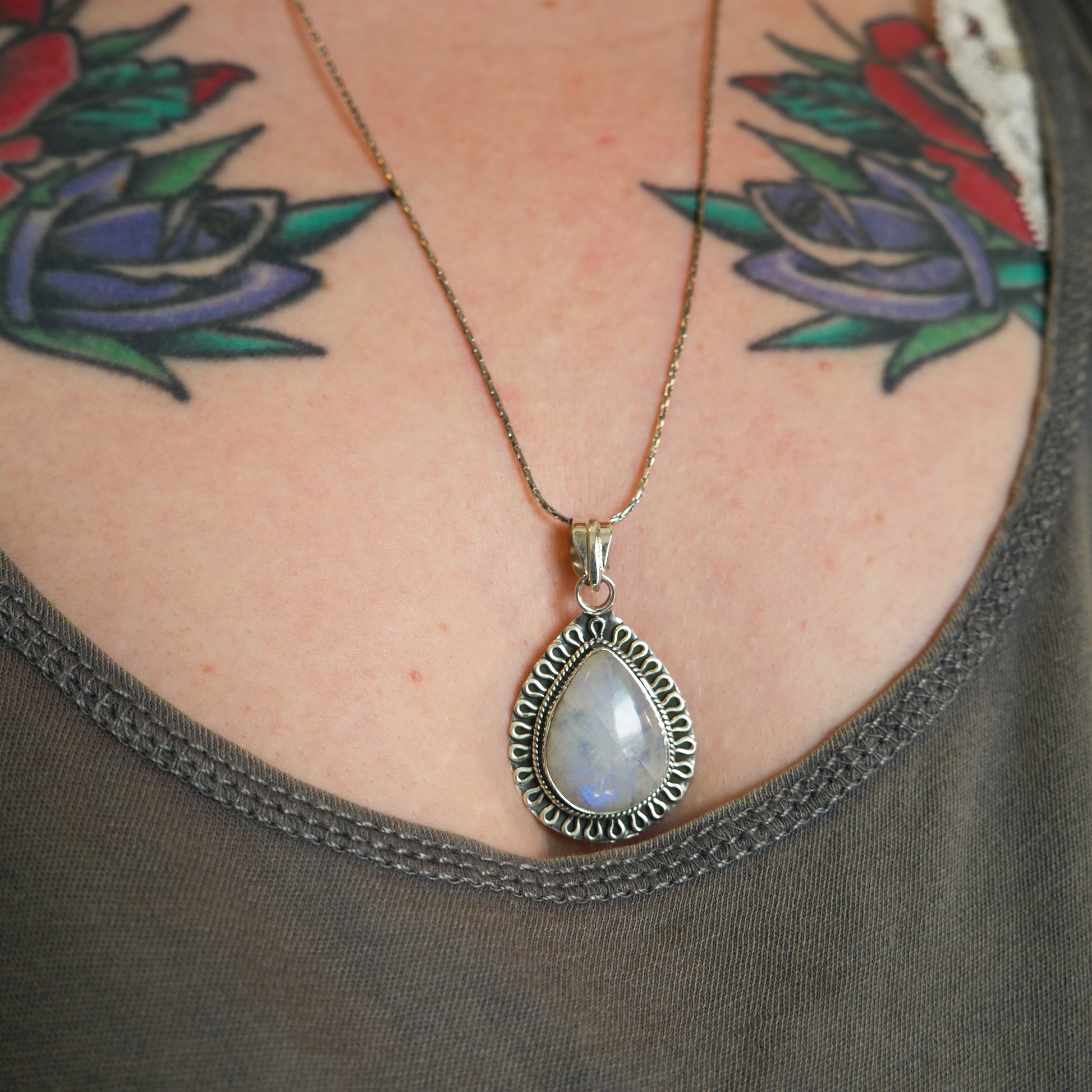 This necklace is crafted in Sterling Silver and features a luminous Moonstone teardrop pendant with embossed, flowing lines for a unique, organic design. The necklace exudes a delicate, feminine charm. It's perfect for everyday wear or layered effortlessly with other pieces from your collection.