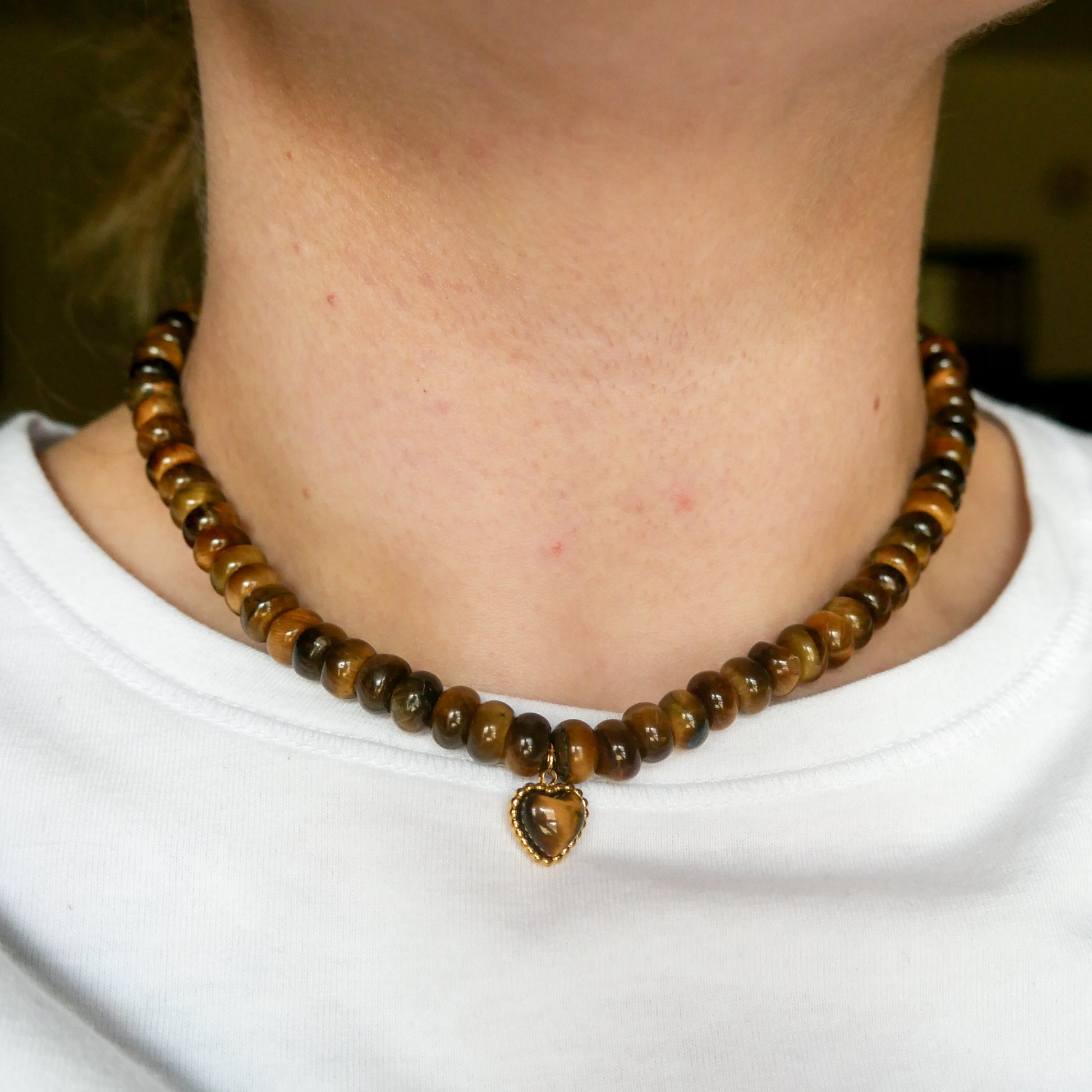 This handmade necklace is crafted with stunning Tiger’s Eye beads, known for their protective and grounding energy. At the center sits a petite Tiger’s Eye heart charm, adding a sweet and meaningful touch to the design.